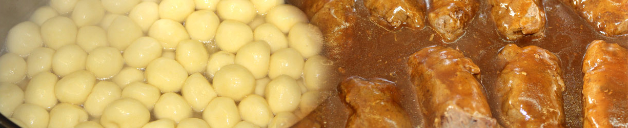 Hühnersuppe mit Nudeln, Rinder- oder Schweineroulade, Schweine- oder Rinderbraten, Klöße, Salzkartoffeln, Rotkohl und Krautsalat.